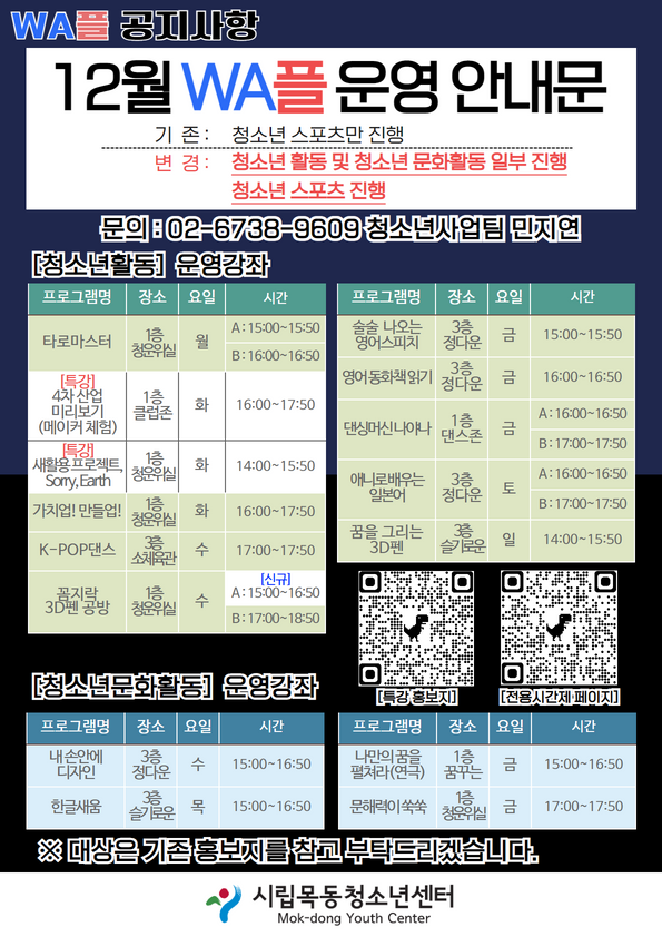 | û¼Ò³âÀü¿ë½Ã°£Á¦ WAÇà 12¿ù ¿î¿µ º¯°æ»çÇ× ¾È³» | ||