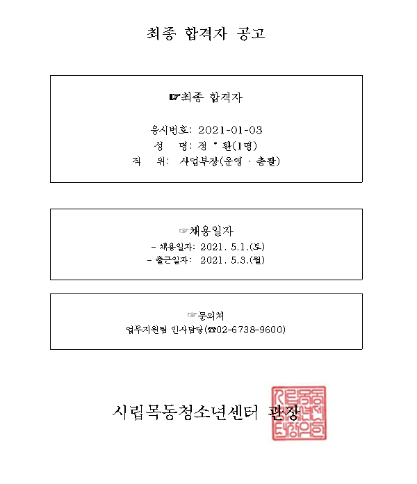 | [½Ã¸³¸ñµ¿Ã»¼Ò³â¼¾ÅÍ] »ç¾÷ºÎÀå(¿î¿µ ¡¤ ÃѰý) ÃÖÁ¾ ÇÕ°ÝÀÚ °ø°í | ||