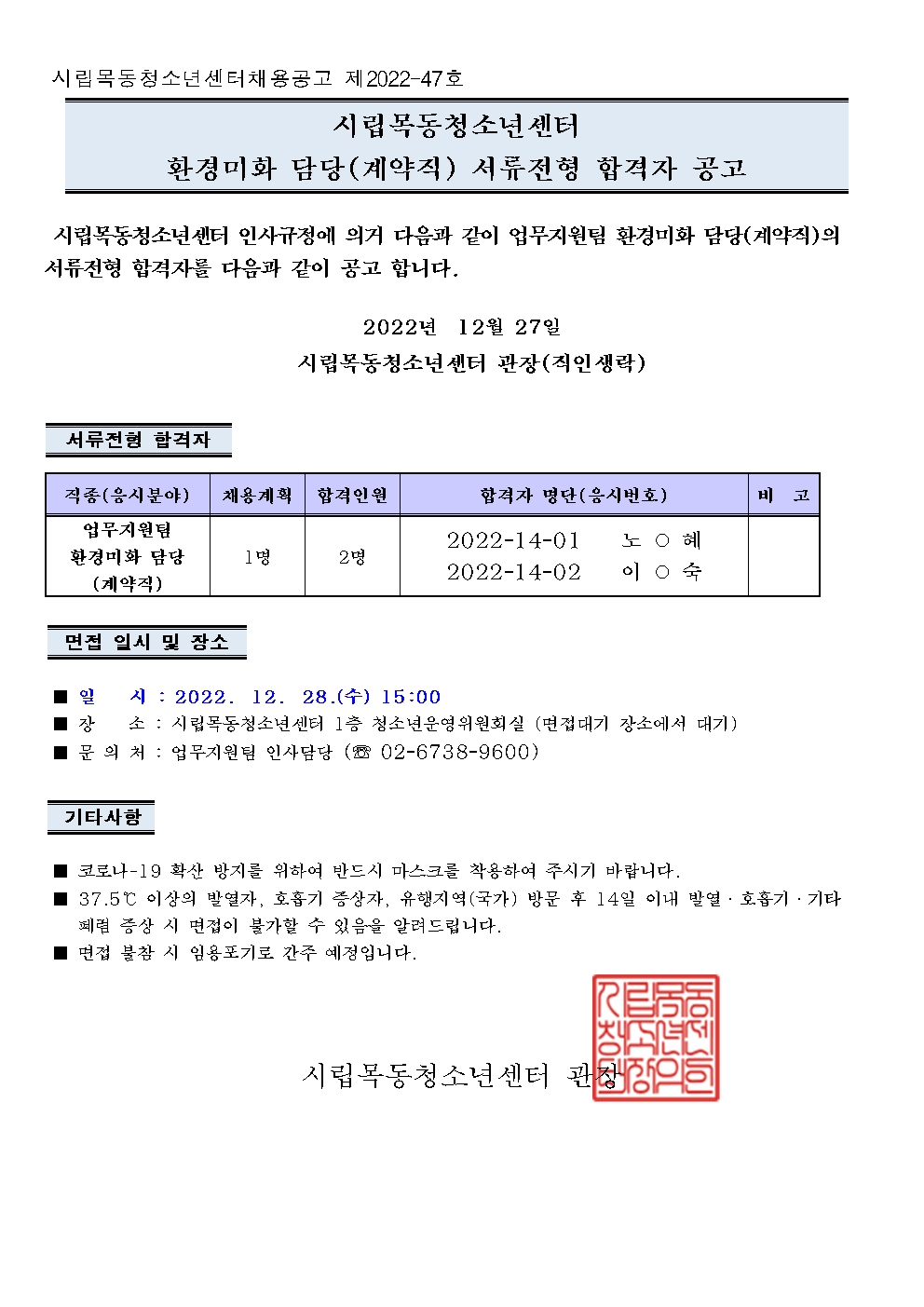 | [½Ã¸³¸ñµ¿Ã»¼Ò³â¼¾ÅÍ] ¾÷¹«Áö¿øÆÀ ȯ°æ¹ÌÈ(°è¾àÁ÷) ¼·ùÀüÇü ÇÕ°ÝÀÚ °ø°í | ||