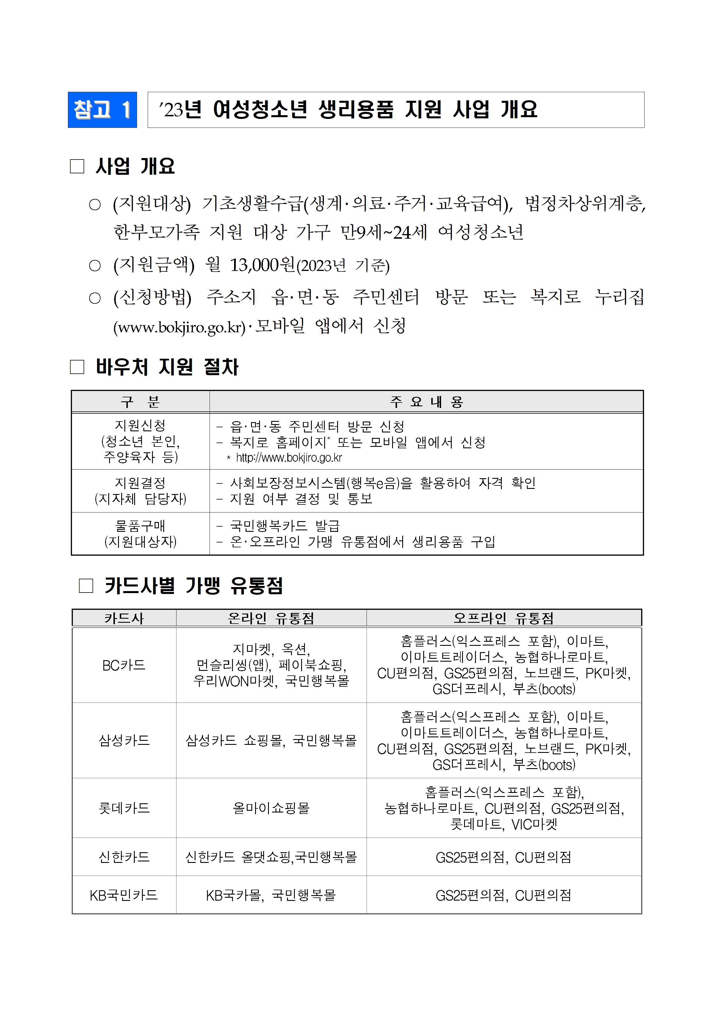| 2023³â ¿©¼ºÃ»¼Ò³â »ý¸®¿ëǰ ¹Ù¿ìó Áö¿ø ¾È³» | ||