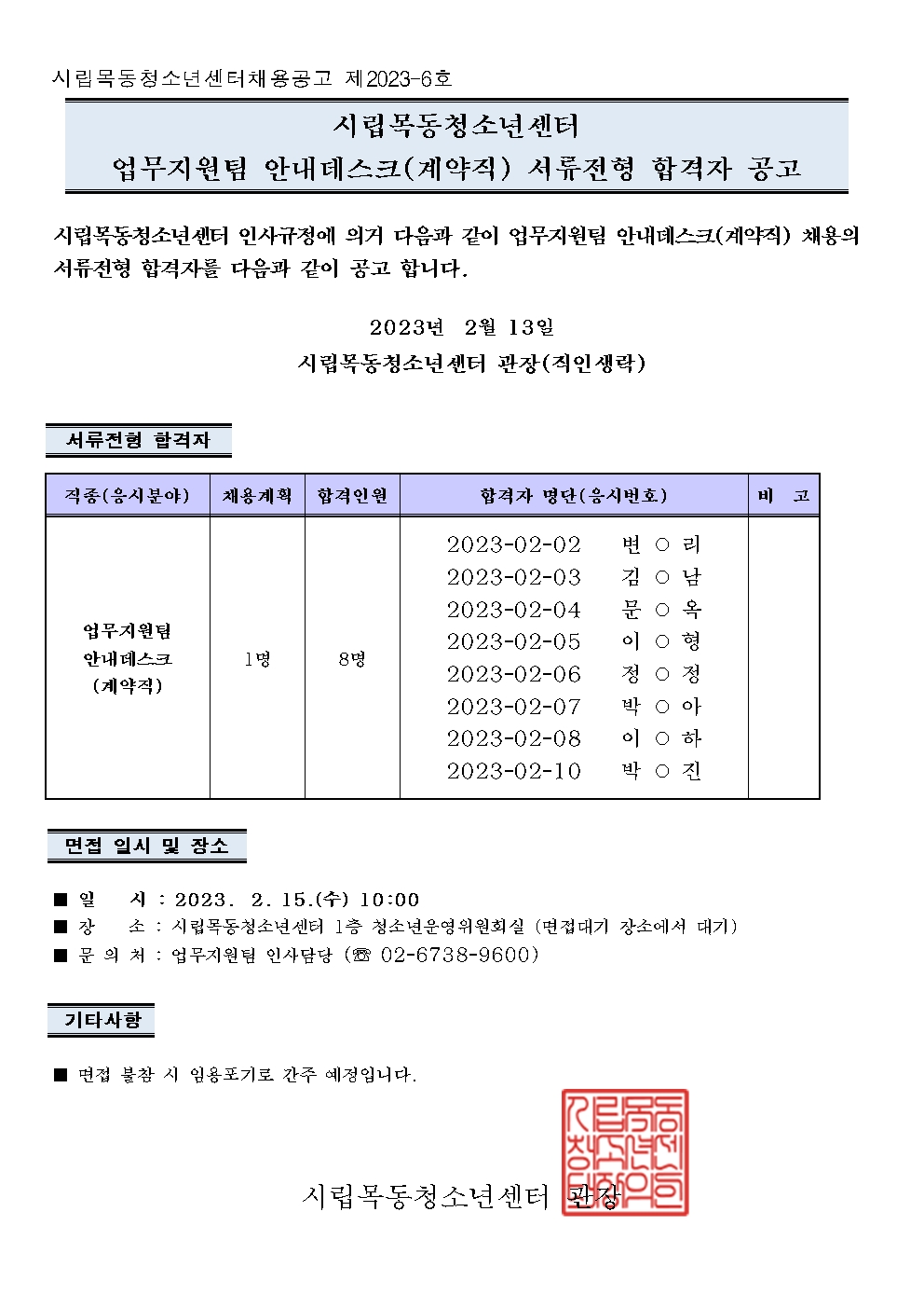 | [½Ã¸³¸ñµ¿Ã»¼Ò³â¼¾ÅÍ] ¾÷¹«Áö¿øÆÀ ¾È³»µ¥½ºÅ©(°è¾àÁ÷) ¼·ùÀüÇü ÇÕ°ÝÀÚ °ø°í | ||