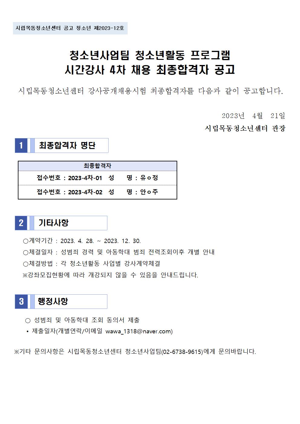 | [½Ã¸³¸ñµ¿Ã»¼Ò³â¼¾ÅÍ] û¼Ò³â»ç¾÷ÆÀ û¼Ò³âȰµ¿ ÇÁ·Î±×·¥ ½Ã°£°»ç 4Â÷ ä¿ë ÃÖÁ¾ÇÕ°ÝÀÚ °ø°í | ||