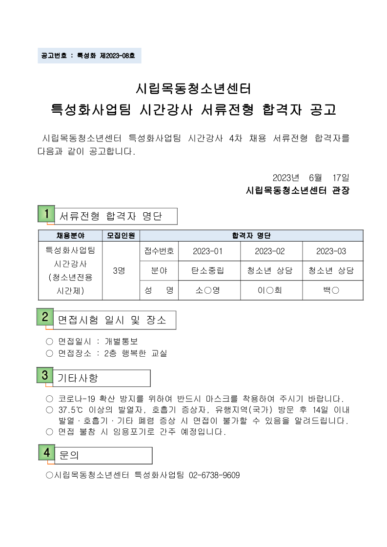 | [½Ã¸³¸ñµ¿Ã»¼Ò³â¼¾ÅÍ] Ư¼ºÈ»ç¾÷ÆÀ ½Ã°£°»ç 4Â÷ ä¿ë ¼·ùÀüÇü ÇÕ°ÝÀÚ °ø°í | ||