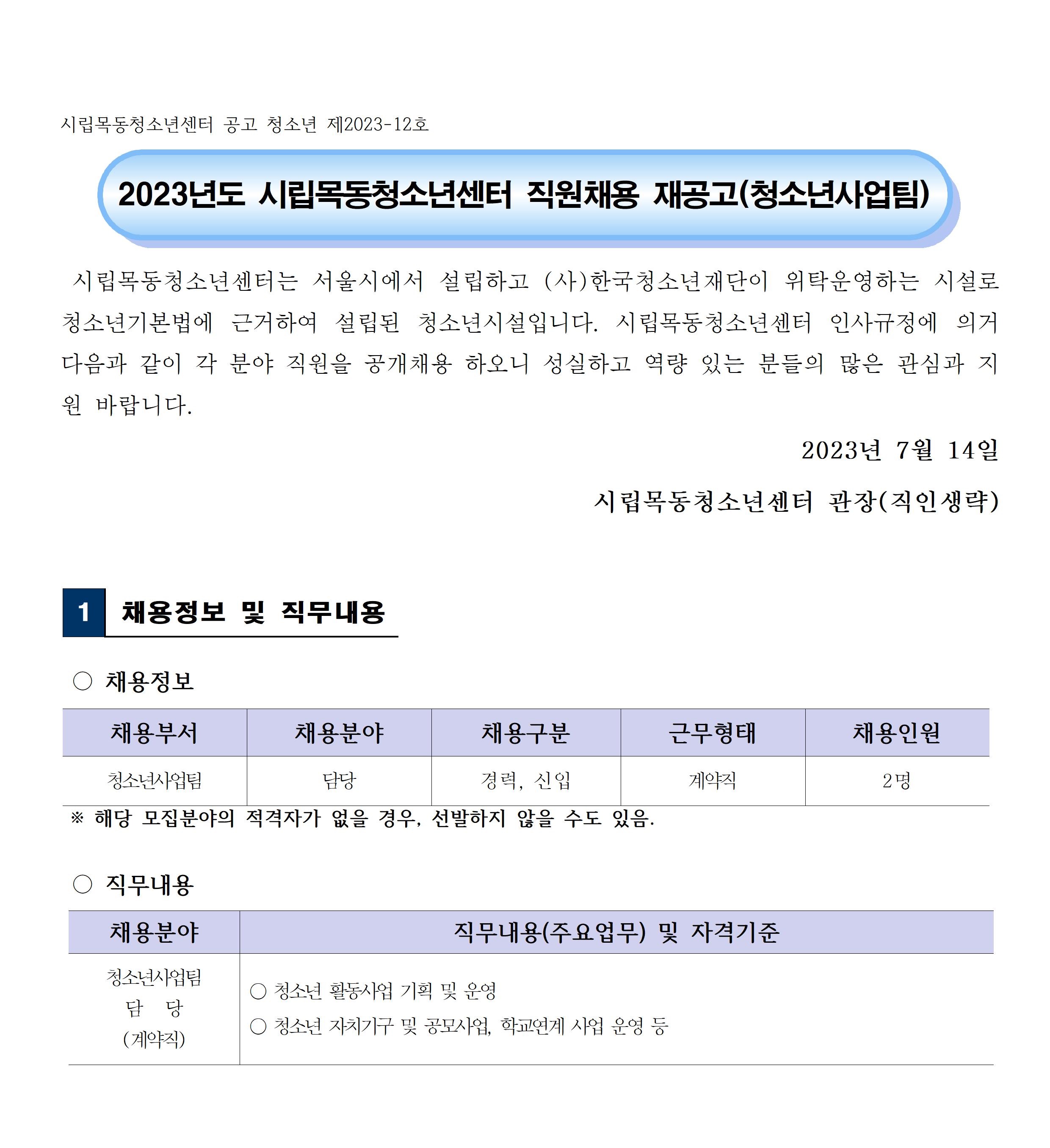 | [½Ã¸³¸ñµ¿Ã»¼Ò³â¼¾ÅÍ] û¼Ò³â»ç¾÷ÆÀ °è¾àÁ÷(´ã´ç) ä¿ë Àç°ø°í | ||