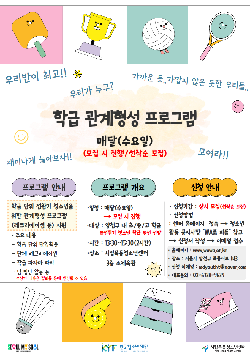 1. ±â °£: 2024³â 4¿ù ~ 12¿ù(¸Å´Þ ¿î¿µ) 2. ´ë »ó: ¾çõ±¸ Áö¿ª ³» ÃÊ/Áß/°íµîÇб³ ÇÐ±Þ ´ÜÀ§ ¡ØÀüȯ±â(Ãʵî 1Çгâ, Áßµî 1Çгâ, °íµî 1Çгâ, °íµî 3Çгâ) ÇÐ±Þ ¿ì¼± ¼±¹ß 3. Àå ¼Ò: ½Ã¸³¸ñµ¿Ã»¼Ò³â¼¾ÅÍ ³» ¼ÒüÀ°°ü 4. ³» ¿ë: »õÇÐ±â ¹× ½ÃÇè±â°£, ¼ö´É Á¾·á ÈÄ Ã»¼Ò³â ´ë»ó ´ÜÇÕȰµ¿ Áö¿ø ÇÐ±Þ ´ÜÀ§ ´ÜÇÕȰµ¿, ´Üü ·¹Å©¸®¿¡À̼Ç, ÆÀ ºôµù Ȱµ¿, ±âŸ(ÇùÀÇ) 5. Âü °¡ ºñ: ¹«·á 6. ½Åû¾È³» - »ó½Ã¸ðÁý(2024³â 4¿ù ~ 12¿ù) - ¼±Âø¼ø ¸¶°¨ µÉ ¼ö ÀÖÀ½ - ÇÏ·ç¿¡ 1Çб޸¸ ½Åû °¡´É(ÃÖ´ë ¼ö¿ëÀοø 30¸í) - ´ã´çÀÚ ÇùÀÇ ÈÄ È°µ¿ ³»¿ë ¹× ÀÏÁ¤ Á¶À² °¡´É 7. Á¢¼ö¹æ¹ý: ½Åû¼ À̸ÞÀÏ Á¦Ãâ ÈÄ ´ã´çÀÚ ÇùÀÇ ÈÄ °áÁ¤ / ¼±Âø¼ø Á¢¼ö