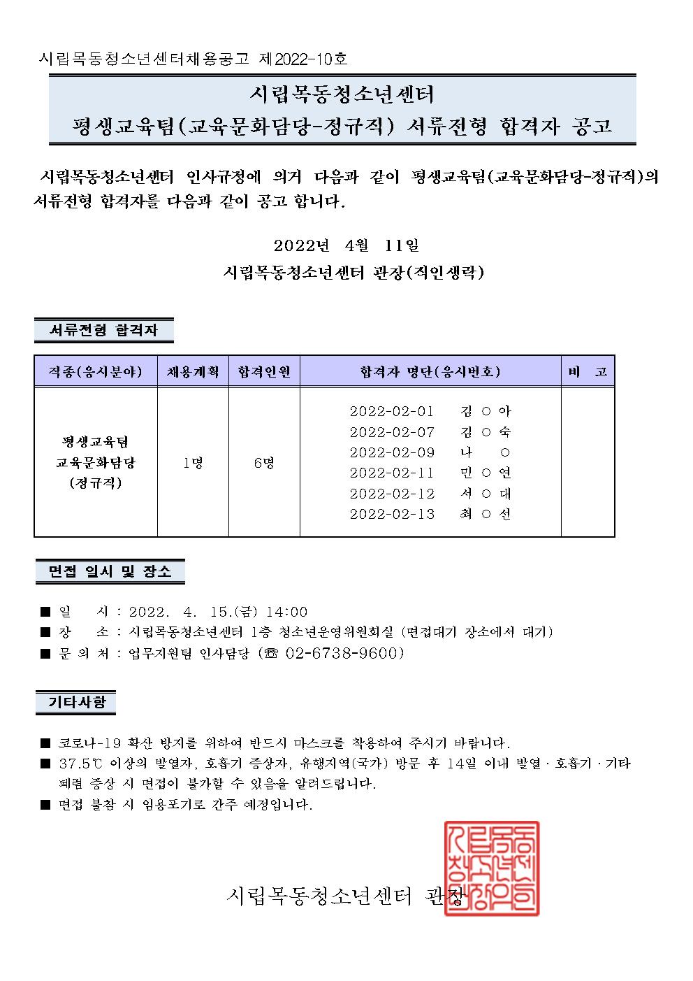 | [½Ã¸³¸ñµ¿Ã»¼Ò³â¼¾ÅÍ] Æò»ý±³À°ÆÀ (±³À°¹®È´ã´ç-Á¤±ÔÁ÷) ¼·ùÀüÇü ÇÕ°ÝÀÚ °ø°í | ||