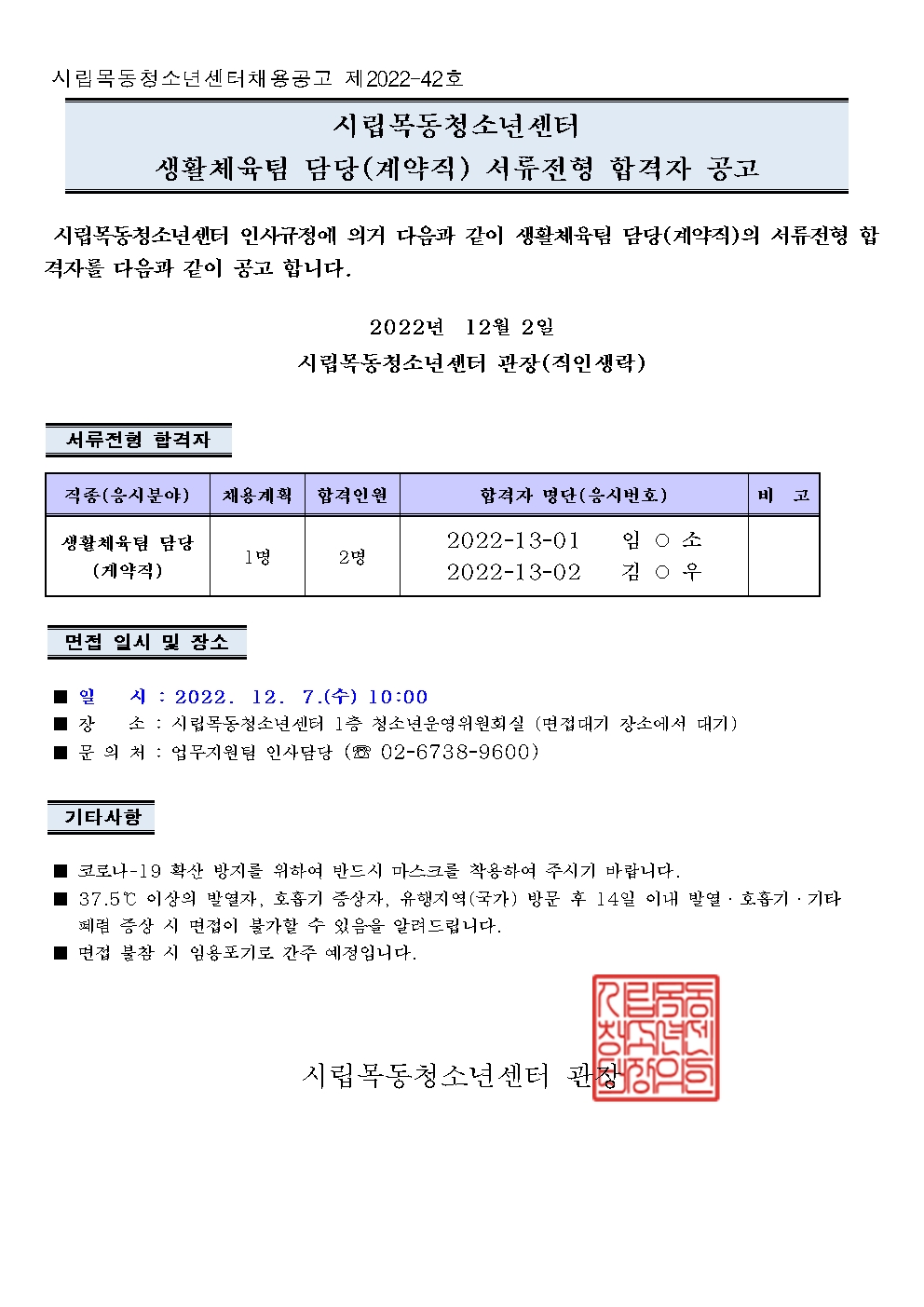 | [½Ã¸³¸ñµ¿Ã»¼Ò³â¼¾ÅÍ] »ýȰüÀ°ÆÀ ´ã´ç(°è¾àÁ÷) Á÷¿ø ä¿ë ¼·ùÀüÇü ÇÕ°ÝÀÚ °ø°í | ||