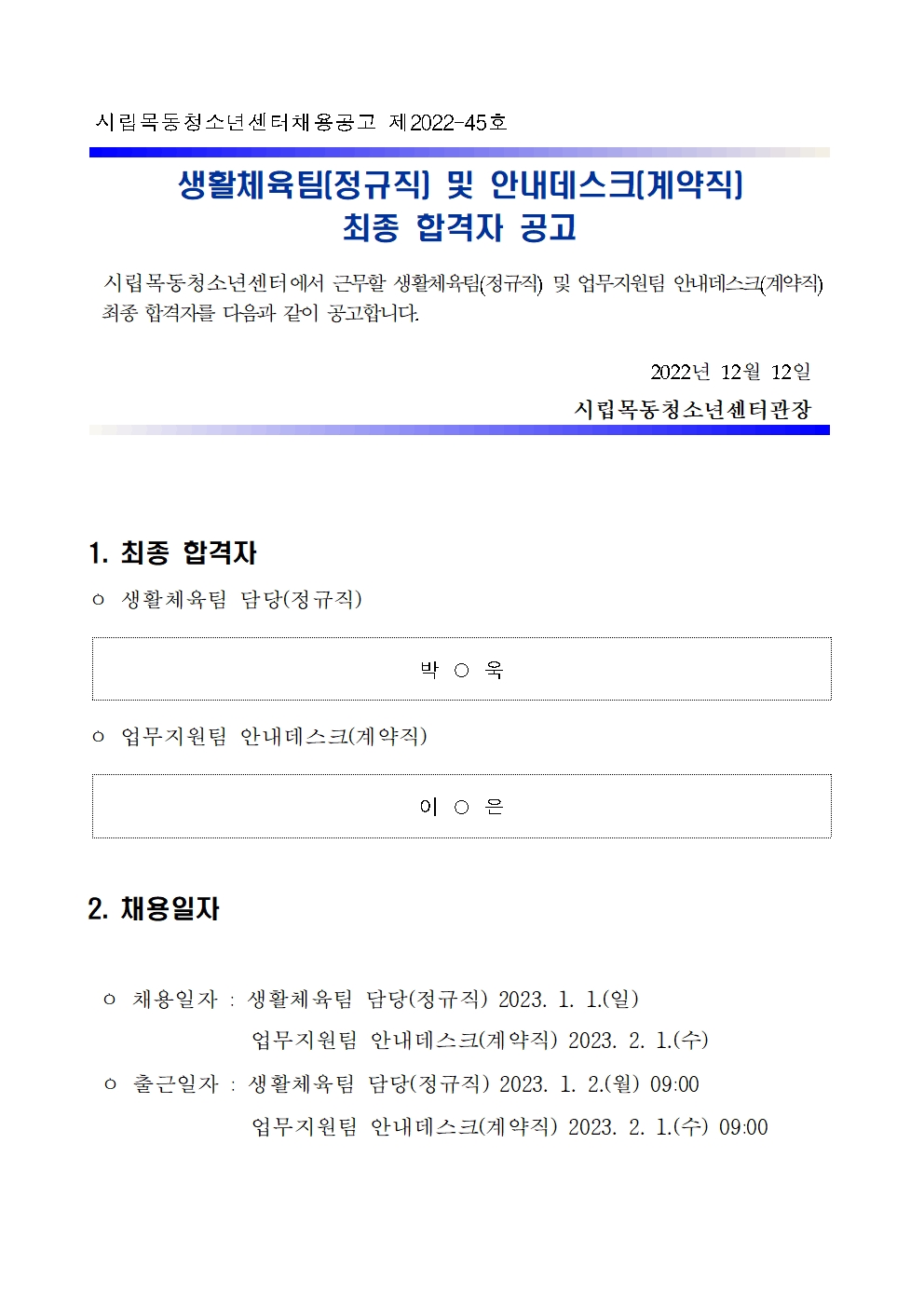 | [½Ã¸³¸ñµ¿Ã»¼Ò³â¼¾ÅÍ] »ýȰüÀ°ÆÀ ´ã´ç(Á¤±ÔÁ÷) ¹× ¾÷¹«Áö¿øÆÀ ¾È³»µ¥½ºÅ©(°è¾àÁ÷) ÃÖÁ¾ ÇÕ°ÝÀÚ °ø°í | ||