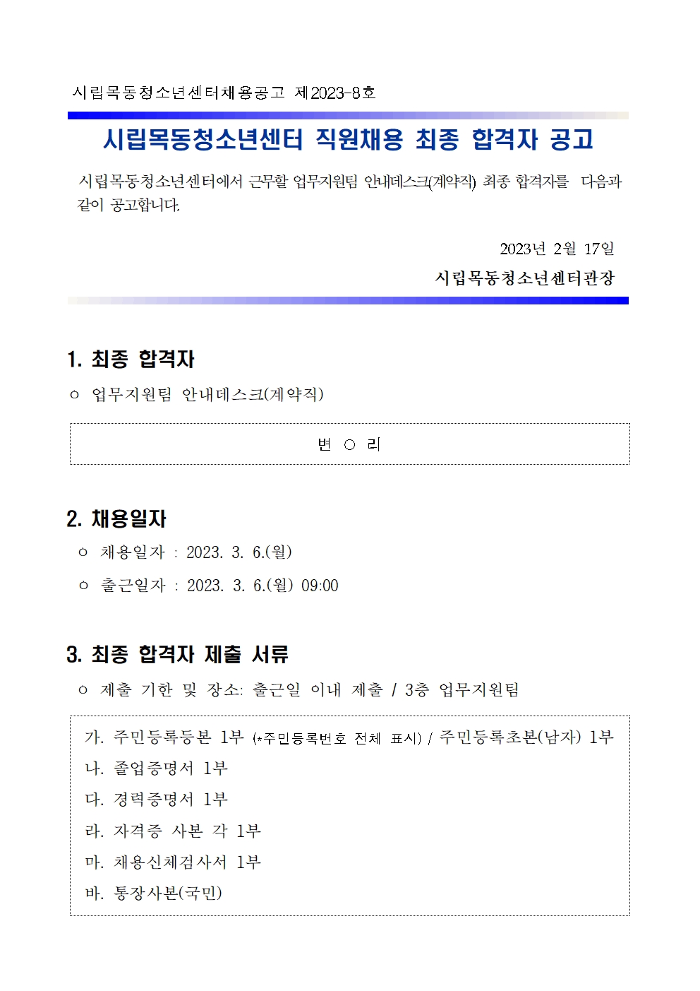 | [½Ã¸³¸ñµ¿Ã»¼Ò³â¼¾ÅÍ] ¾÷¹«Áö¿øÆÀ ¾È³»µ¥½ºÅ©(°è¾àÁ÷) ä¿ë ÃÖÁ¾ ÇÕ°ÝÀÚ °ø°í | ||
