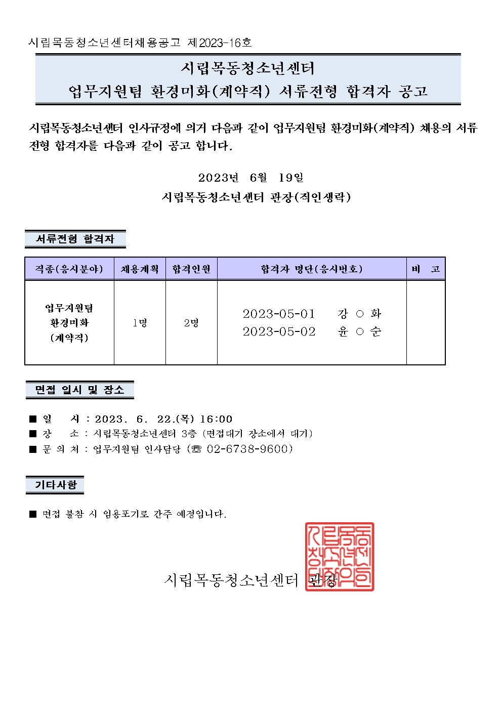 | [½Ã¸³¸ñµ¿Ã»¼Ò³â¼¾ÅÍ] ¾÷¹«Áö¿øÆÀ ȯ°æ¹ÌÈ(°è¾àÁ÷) ä¿ë ¼·ùÀüÇü ÇÕ°ÝÀÚ °ø°í | ||