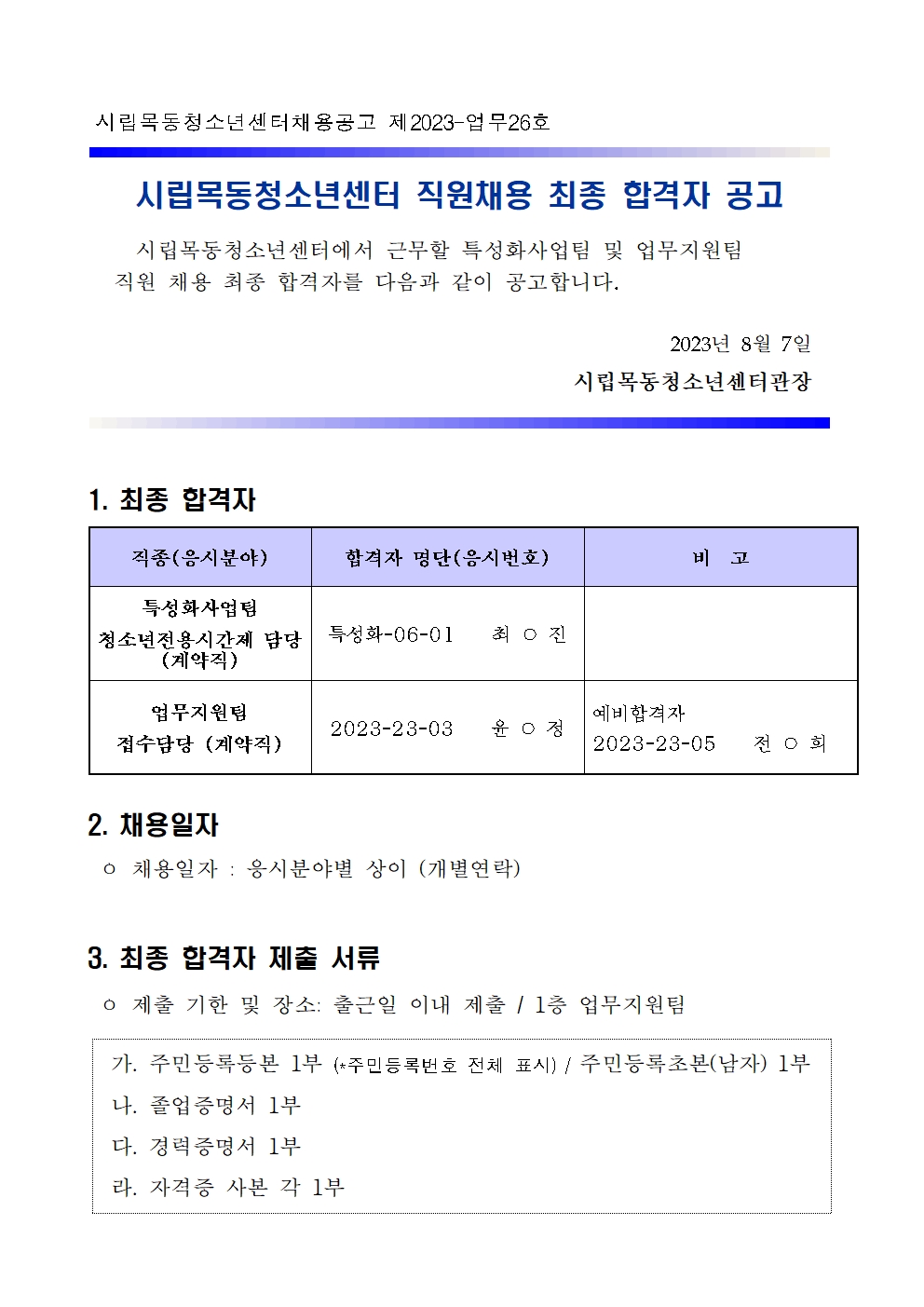 | [ÃÖÁ¾ÇÕ°ÝÀÚ °ø°í] Ư¼ºÈ»ç¾÷ÆÀ(û¼Ò³âÀü¿ë½Ã°£Á¦ ´ã´ç), ¾÷¹«Áö¿øÆÀ(Á¢¼ö ´ã´ç) ÃÖÁ¾ÇÕ°ÝÀÚ °ø°í | ||