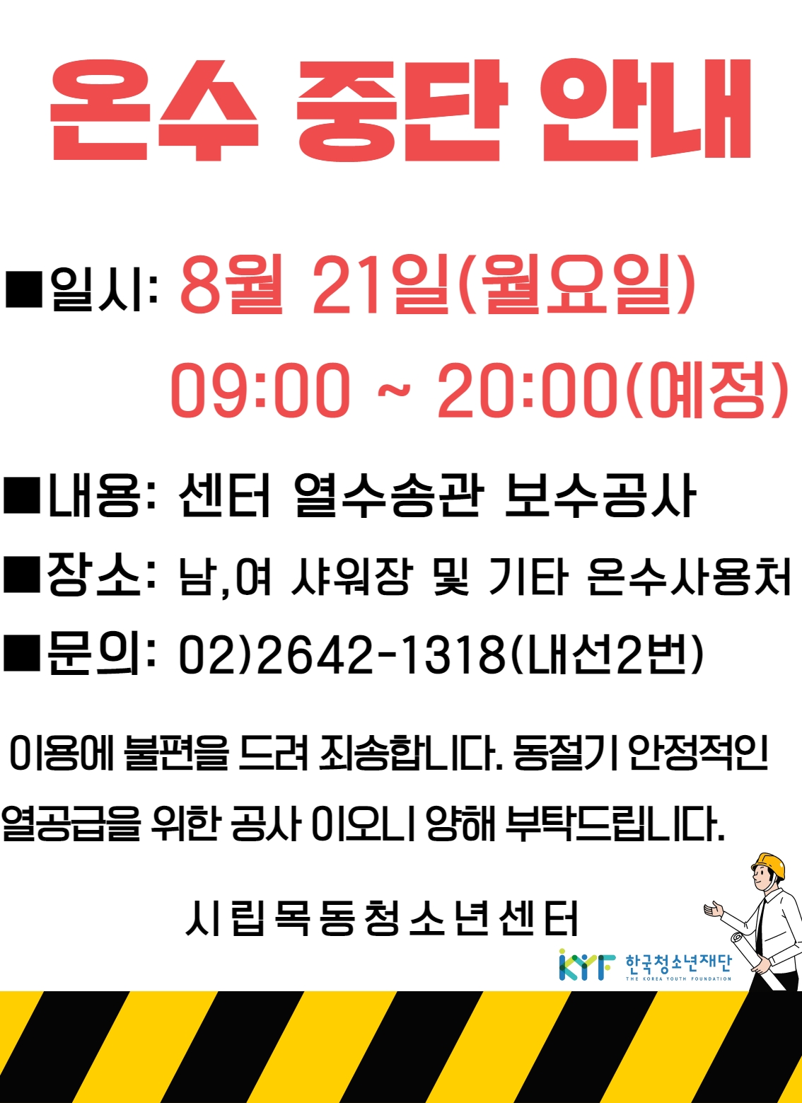 | ¿¼ö¼Û°ü º¸¼ö°ø»ç ½ÃÇàÀ¸·Î º» ¼¾ÅÍ ¿Â¼ö Áß´Ü ¾È³»»çÇ×À» °øÀ¯ µå¸³´Ï´Ù. | ||