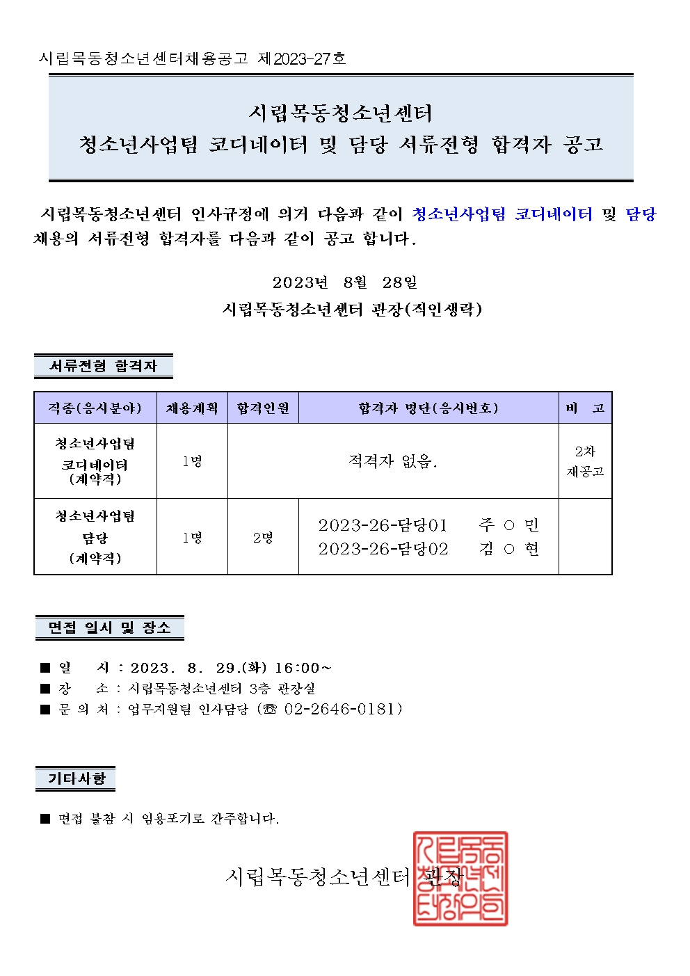 | [¼·ùÇÕ°ÝÀÚ°ø°í] û¼Ò³â»ç¾÷ÆÀ ÄÚµð³×ÀÌÅÍ(°è¾àÁ÷) ¹× ´ã´ç(°è¾àÁ÷) ¼·ùÀüÇü ÇÕ°ÝÀÚ °ø°í | ||