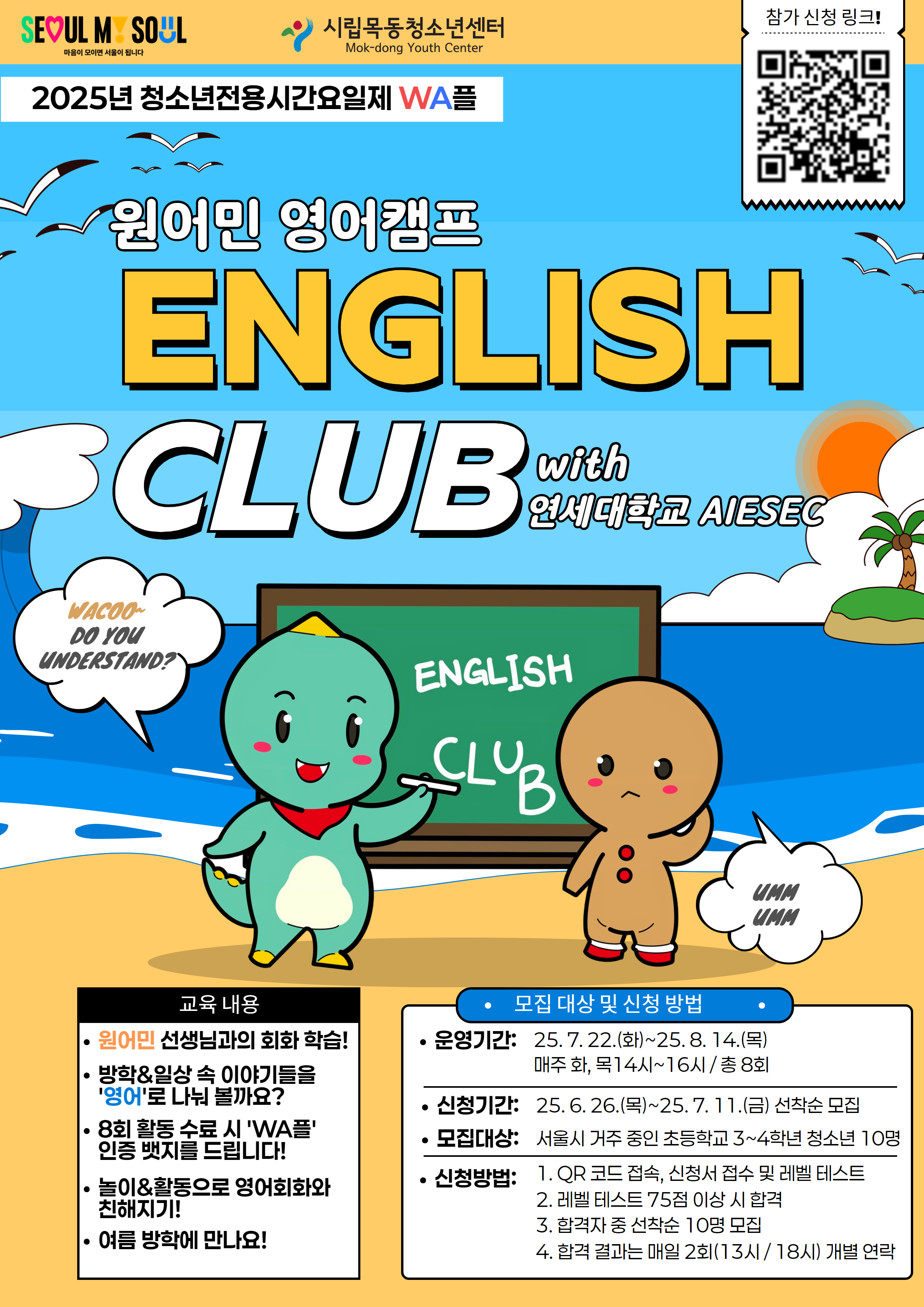 2. ¸ðÁý ´ë»ó: ¼¿ï½Ã °ÅÁÖÁßÀÎ ÃʵîÇб³ 3Çгâ~4Çгâ û¼Ò³â 3. Ȱµ¿ ±â°£: 25. 7. 22.(È)~25. 8. 14.(¸ñ) ¸ÅÁÖ È, ¸ñ 14½Ã~16½Ã!(ÃÑ 8ȸ) 4. ½Åû ¹æ¹ý - QRÄڵ带 ÅëÇØ Á¢¼ö! - ¿Â¶óÀÎ ·¹º§ Å×½ºÆ® 75Á¡ ÀÌ»ó ´Þ¼ºÀÚ¿¡ ÇÑÇØ ÇÕ°Ý ¸Þ½ÃÁö Àü¼Û (¸ÅÀÏ ¿ÀÈÄ 1½Ã, 6½Ã¿¡ Á¤´ä °á°ú¿Í ¼±Á¤ ¶Ç´Â ´ë±âÀÚ È®Á¤ ¸Þ½ÃÁö¸¦ Àü¼ÛÇØµå¸³´Ï´Ù!)