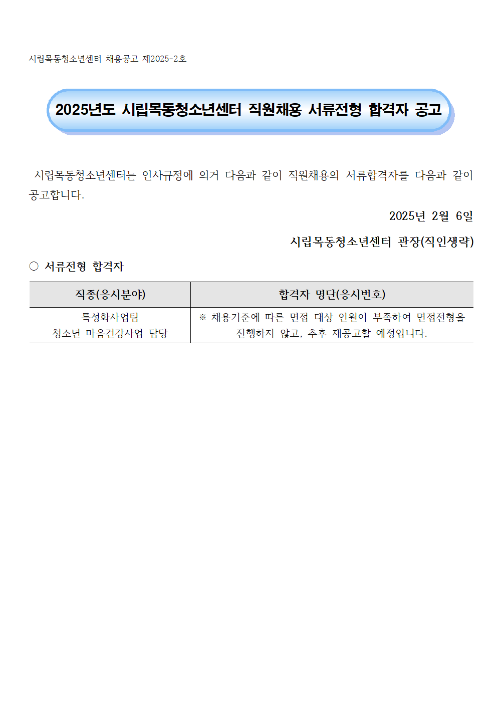 | 2025³âµµ ½Ã¸³¸ñµ¿Ã»¼Ò³â¼¾ÅÍ Á÷¿øÃ¤¿ë ¼·ùÀüÇü ÇÕ°ÝÀÚ °ø°í(Ư¼ºÈ»ç¾÷ÆÀ û¼Ò³â¸¶À½°Ç°»ç¾÷ »ç¾÷ ´ã´ç) | ||