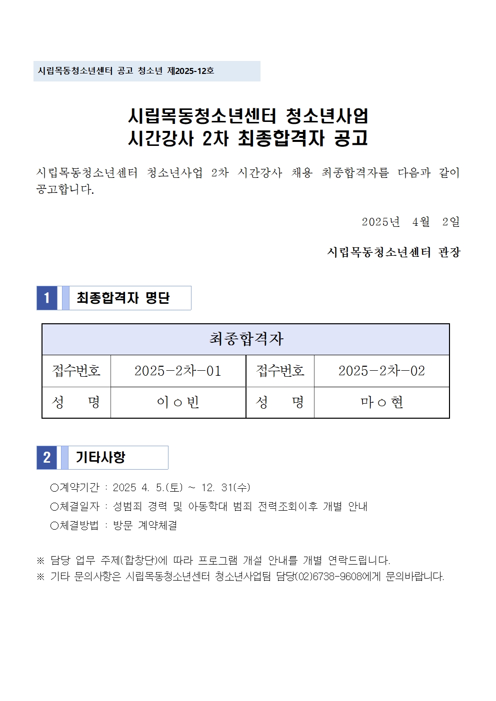 | [½Ã¸³¸ñµ¿Ã»¼Ò³â¼¾ÅÍ] û¼Ò³â»ç¾÷ÆÀ û¼Ò³âȰµ¿ 2Â÷ ½Ã°£°»ç ÃÖÁ¾ÇÕ°ÝÀÚ °ø°í | ||