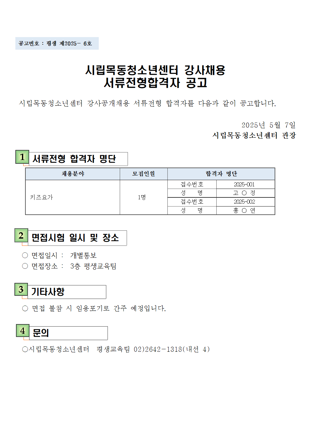 | ÀÌÀü±Û | 2025³âµµ ½Ã¸³¸ñµ¿Ã»¼Ò³â¼¾ÅÍ Á÷¿øÃ¤¿ë °ø°í ¼·ùÀüÇü ÇÕ°ÝÀÚ °ø°í(¼¿ï½Ã Çູµ¿ÇàÇб³ »ç¾÷ ´ã´ç) |