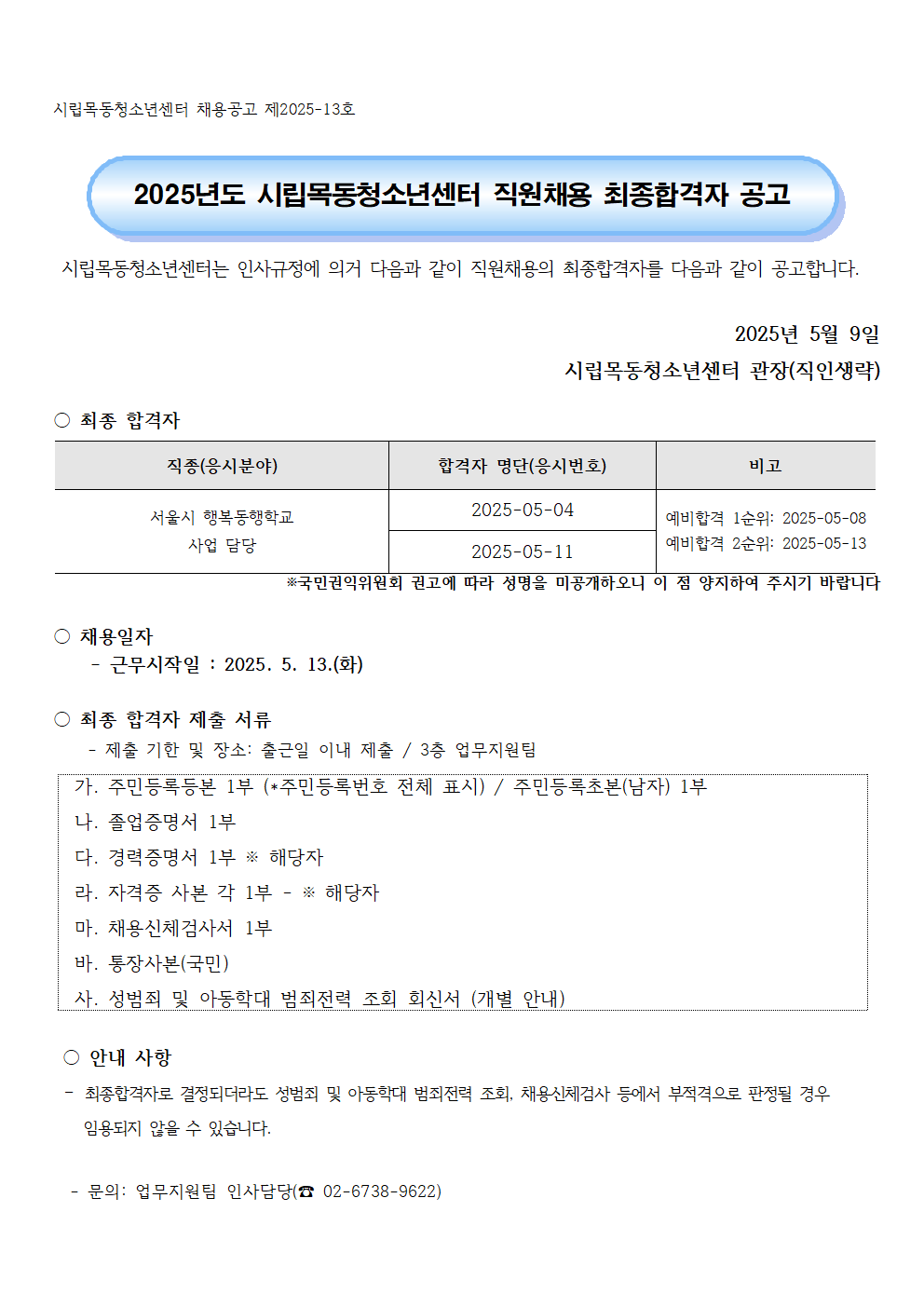 | 2025³âµµ ½Ã¸³¸ñµ¿Ã»¼Ò³â¼¾ÅÍ Á÷¿øÃ¤¿ë °ø°í ÃÖÁ¾ ÇÕ°ÝÀÚ °ø°í(¼¿ï½Ã Çູµ¿ÇàÇб³ »ç¾÷ ´ã´ç) | ||