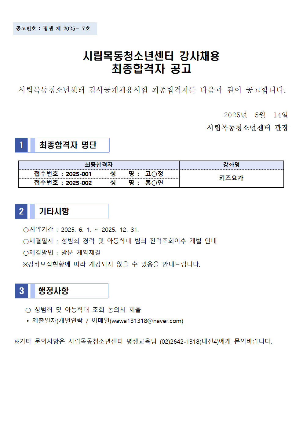| ´ÙÀ½±Û | 2025³âµµ ½Ã¸³¸ñµ¿Ã»¼Ò³â¼¾ÅÍ Á÷¿øÃ¤¿ë °ø°í ÃÖÁ¾ ÇÕ°ÝÀÚ °ø°í(¼¿ï½Ã Çູµ¿ÇàÇб³ »ç¾÷ ´ã´ç) |