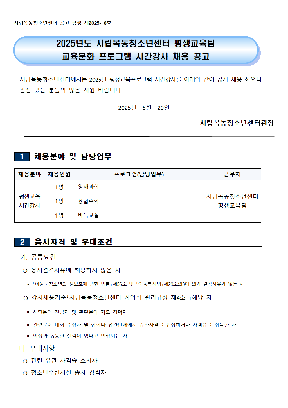 | ´ÙÀ½±Û | [½Ã¸³¸ñµ¿Ã»¼Ò³â¼¾ÅÍ] 2025³â Æò»ý±³À°ÆÀ ±³À°¹®È Á¤±Ô°Á ½Ã°£°»ç ÃÖÁ¾ÇÕ°ÝÀÚ °ø°í |