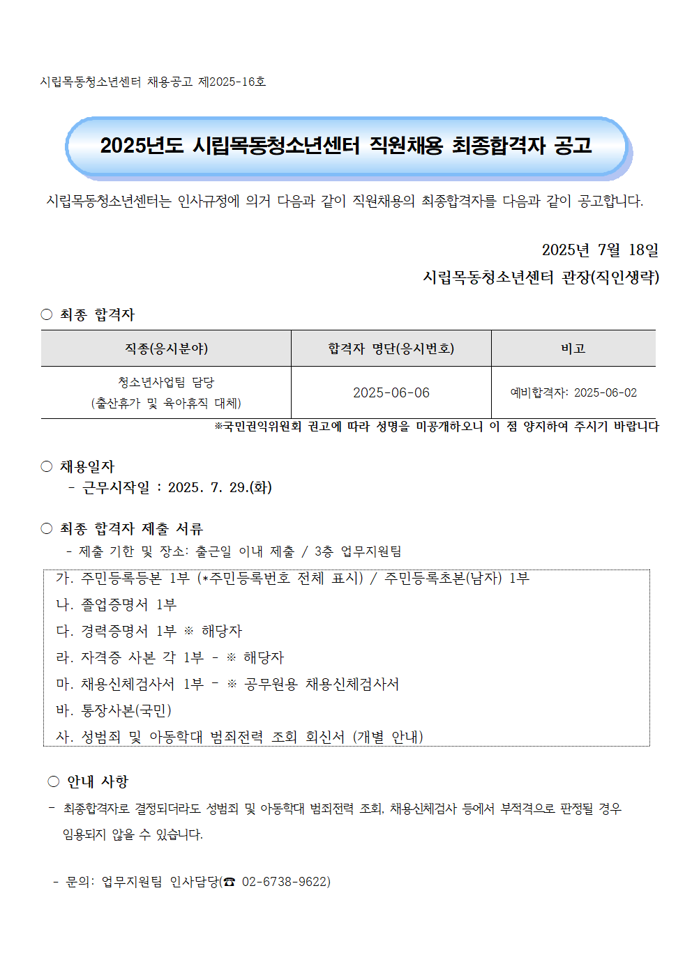 | 2025³âµµ ½Ã¸³¸ñµ¿Ã»¼Ò³â¼¾ÅÍ Á÷¿øÃ¤¿ë °ø°í ÃÖÁ¾ ÇÕ°ÝÀÚ °ø°í(û¼Ò³â»ç¾÷ÆÀ Ãâ»êÈÞ°¡ ¹× À°¾ÆÈÞÁ÷ ´ëüÀÚ) | ||