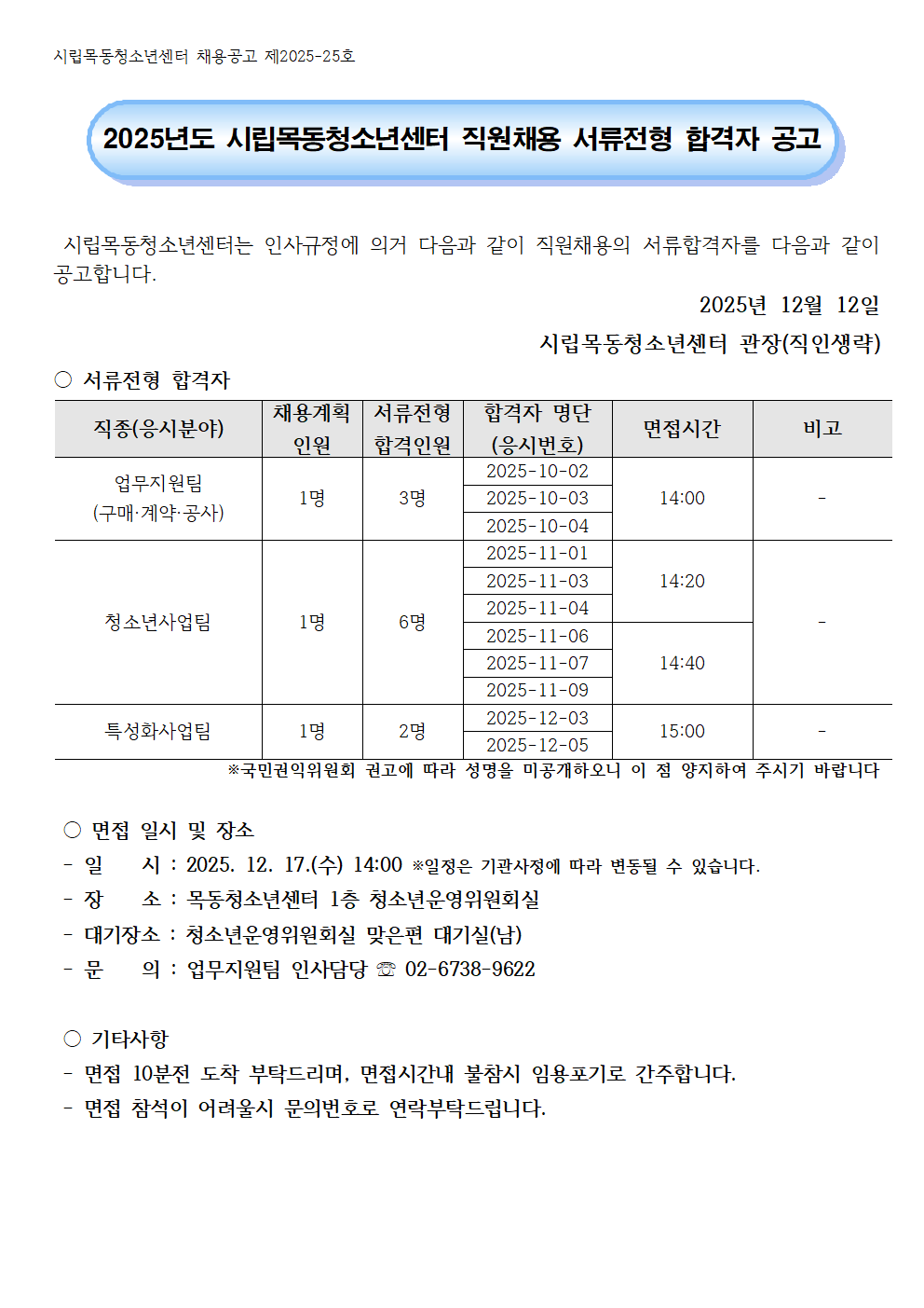 | 2025³âµµ ½Ã¸³¸ñµ¿Ã»¼Ò³â¼¾ÅÍ Á÷¿ø ä¿ë ¼·ùÇÕ°ÝÀÚ °ø°í(¾÷¹«Áö¿øÆÀ ±¸¸Å¡¤°è¾à¡¤°ø»ç, û¼Ò³â»ç¾÷ÆÀ, Ư¼ºÈ»ç¾÷ÆÀ) | ||