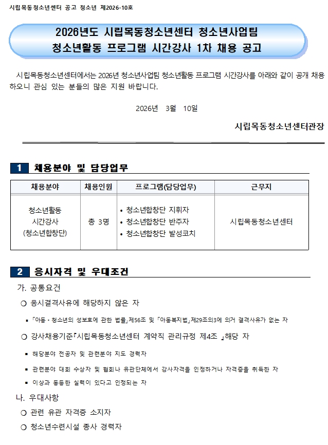 | ´ÙÀ½±Û | 2026³âµµ ½Ã¸³¸ñµ¿Ã»¼Ò³â¼¾ÅÍ Á÷¿øÃ¤¿ë ÃÖÁ¾ÇÕ°ÝÀÚ °ø°í(Ư¼ºÈ»ç¾÷ÆÀ-Á¤±ÔÁ÷, Æò»ý±³À°ÆÀ-°è¾àÁ÷) |
