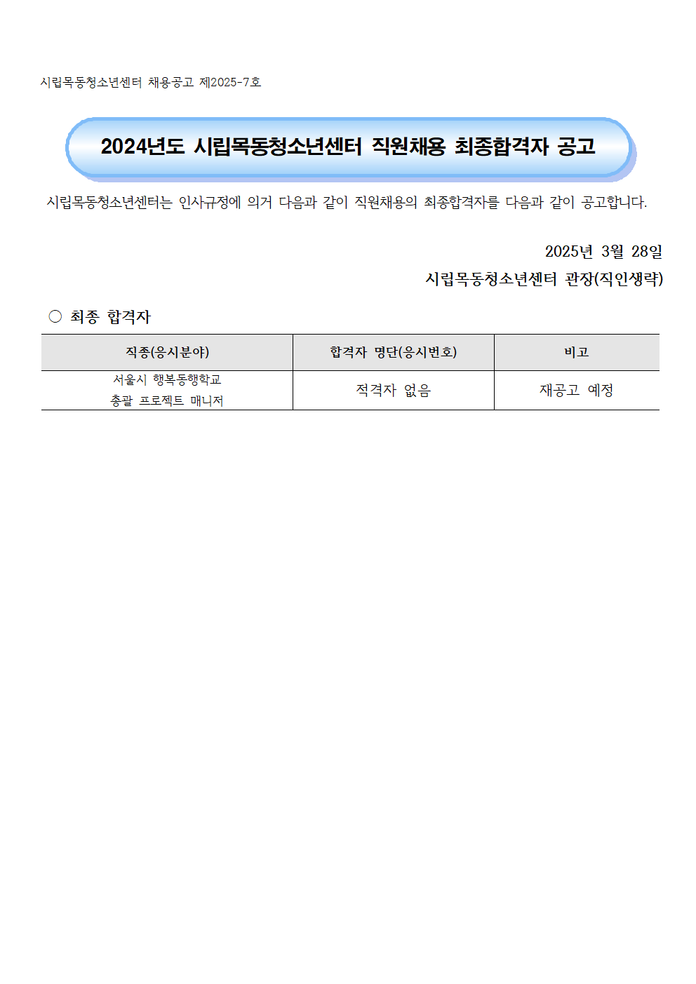 | 2025³âµµ ½Ã¸³¸ñµ¿Ã»¼Ò³â¼¾ÅÍ Á÷¿øÃ¤¿ë ÃÖÁ¾ ÇÕ°ÝÀÚ °ø°í(¼¿ï½Ã Çູµ¿ÇàÇб³ ÃѰý ÇÁ·ÎÁ§Æ® ¸Å´ÏÀú) | ||