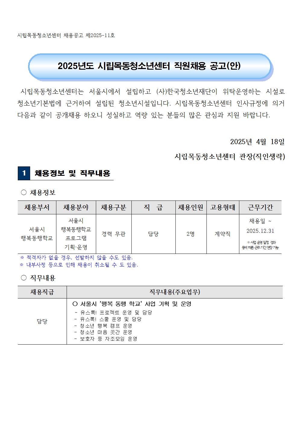 | 2025³âµµ ½Ã¸³¸ñµ¿Ã»¼Ò³â¼¾ÅÍ Á÷¿øÃ¤¿ë Àç°ø°í(¼¿ï½Ã Çູµ¿ÇàÇб³ »ç¾÷ ´ã´ç 2¸í) | ||