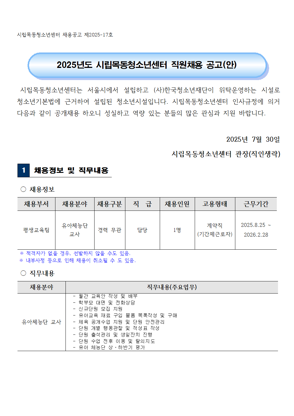 | 2025³âµµ ½Ã¸³¸ñµ¿Ã»¼Ò³â¼¾ÅÍ Á÷¿øÃ¤¿ë °ø°í(Æò»ý±³À°ÆÀ-À¯¾ÆÃ¼´É´Ü ±³»ç) | ||