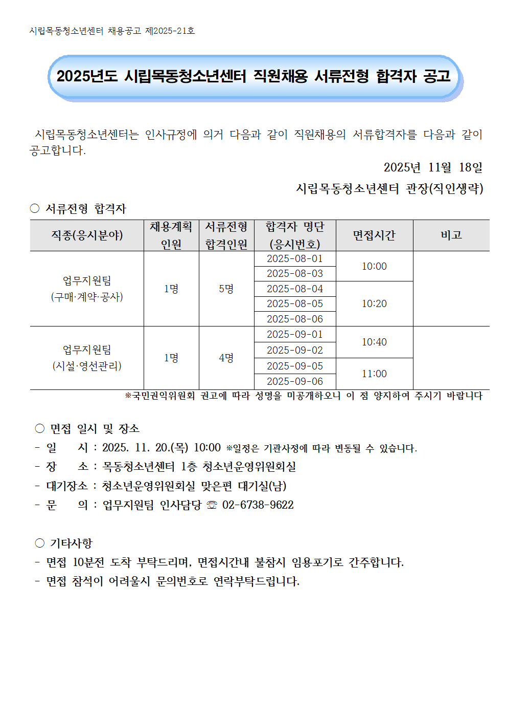 | ÀÌÀü±Û | 2025³âµµ ½Ã¸³¸ñµ¿Ã»¼Ò³â¼¾ÅÍ Á÷¿øÃ¤¿ë ÃÖÁ¾ÇÕ°ÝÀÚ °ø°í(¾÷¹«Áö¿øÆÀ-±¸¸Å¡¤°è¾à¡¤°ø»ç, ½Ã¼³ ¿µ¼±°ü¸®) |