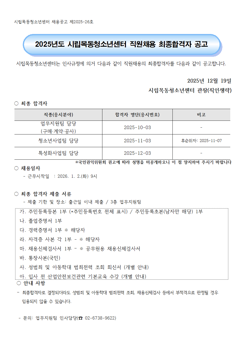 | 2025³âµµ ½Ã¸³¸ñµ¿Ã»¼Ò³â¼¾ÅÍ Á÷¿ø ä¿ë ÃÖÁ¾ÇÕ°ÝÀÚ °ø°í(¾÷¹«Áö¿øÆÀ ±¸¸Å¡¤°è¾à¡¤°ø»ç, û¼Ò³â»ç¾÷ÆÀ, Ư¼ºÈ»ç¾÷ÆÀ) | ||